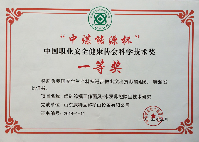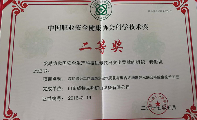 濟寧市首屆創(chuàng)新大賽“煤礦采掘面濕噴除塵系統(tǒng)設(shè)備”創(chuàng)新組二等獎